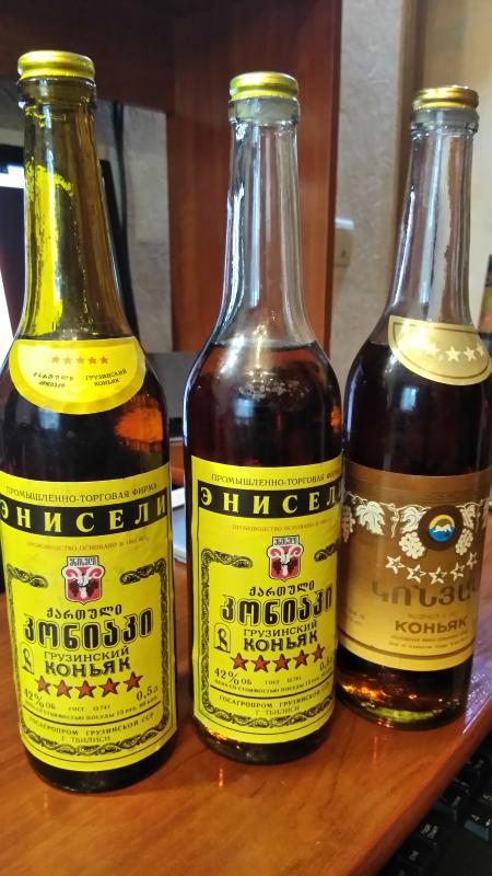 При ревизии дедушкиной коллекции спиртного обнаружены следующие экземпляры: грузинский коньяк "Энисели" 1983 и 1989 года, армянский коньяк "Арарат" 1984 года, молдавский - "Дачия-Феникс" (Белый аист") 1990 года.