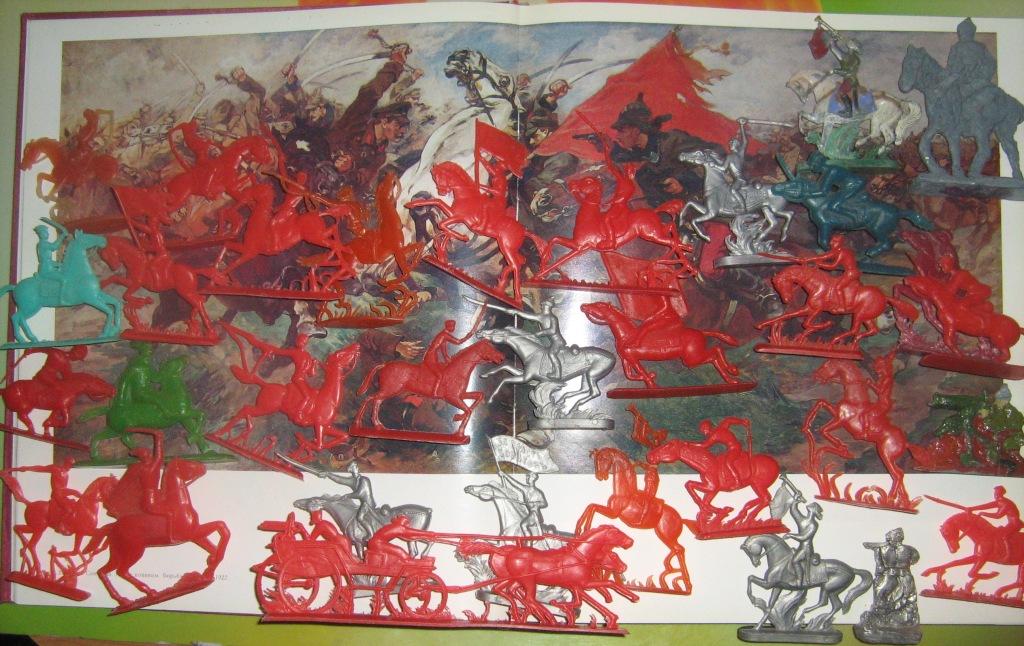 Уууу.... Кто только не делал... На этом снимке и Москва (включая нечастые ранние производства ЗМИ-1), и Одесса, и редкий Котовск и наиредчайшие оловянные Ростов-на-Дону (пробные отливки, в серию не пошли). Насчёт скульпторов у меня информации мало, с гарантией только покойный Савельев-старший (серебристые по центру). Увы, на книжный разворот всё не помещается... Однако видов кавалерии столько, что я даже четверти наборов не собрал, не говоря уже о разновидностях по цветам и штампам... Так что есть к чему стремиться. Потому и ограничился конницей, что собрать ВСЕХ советских солдатиков не потяну финансово - я не починок. Вот пластиковых улан ПНР ищу, это да. Вроде и стоят копейки, а не попадаются, а то ведь с кем будённовцам сражаться? Русские с русскими драться не должны даже понарошку. Школа красных командиров комсостав стране лихой куёт -