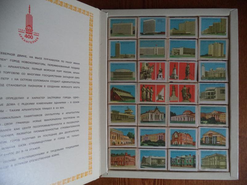 Набор спичек к 400-летию Архангельска. Коробки полные, с оригинальными спичками с головками зеленого цвета. 1984 год. Набор имеет состояние нового. Цена - 800 руб.