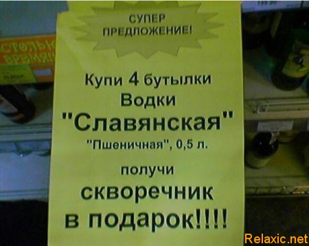 Говорят: это было на самом деле. Однажды во время спектакля за кулисами послышался выстрел — это застрелился муж героини. На сцену вбежал актер. Ермолова в страшном волнении: «Кто стрелял?» Актер не переводя дыхания вместо «Ваш муж!» выпалил: «Вах мух!» Ермолова повторила в ужасе: «Мох мух?» — и упала без чувств... ![]() - Пессимист видит только бесконечный тоннель. Оптимист видит свет в конце тоннеля. Реалист видит тоннель, свет и поезд, идущий навстречу. И только машинист поезда видит трёх идиотов, сидящих на рельсах! - Привет! Ты чего к телефону не подходишь? - В туалете был... - Два месяца? Переписка двух блондинок в аське: - Привет! Как выходные? - Удались! - Сама удались, дура! Идут чукча с геологом. Вдруг видят - прямо на них несется белый медведь. Чукча кидается надевать лыжи. Геолог: - Бесполезно. Ты все равно не сможешь бежать быстрее медведя. Чукча: - Неважно. Главное - бежать быстрее тебя. В роддоме: - Поздравляю, у вас двойня! - О, какое совпадение: я владелец фирмы "Два орла"! Ко второму отцу: - А у вас тройня! - О, и снова совпадение: я владелец фирмы "Три орешка"! Третий отец заметно побледнел, медсестра ему: - Вам плохо? - Я владелец фирмы "Семь гномов"... )) - Папа, папа, а кто это там в углу - лохматенький, с красными глазками всю ночь сидит? - Не бойся, малыш, это же наша мама в "Одноклассниках"... - Почему позакрывали казино? - Так они людей обирали до нитки. - Тогда почему налоговую не закроют? - Сэр, вчера в театре я видел вашу супругу. Она так кашляла, что все на нее оглядывались. У нее грипп? - Нет, у нее новое платье! - У вас "Одноклассники" на работе заблокированы? - Не знаю... - За этот ответ тебе повышается зарплата вдвое! - Синдром Золушки внезапен, жесток и беспощаден. Встала ночью водички попить, хотела вытереть пятно со стола и вымыла всю кухню... - Спорим на 100$, что ты мне сейчас вопрос задашь? - Какой? - Ну вот, ты мне его и задал. Маньяк отравленные деньги На счёт детдома перевёл. Погибло двадцать депутатов, Два мэра и один министр. - Помнишь, ты мне на зиму посоветовал окна заклеить?.. - Что, теперь тепло? - Теперь темно! - Доктор, я умру? - Хуже... - А что может быть хуже? - Будем лечить! - Такого козла еще поискать... - Но я-то умница, я-то нашла! - Еду на лето в лагерь вожатым. Как думаешь, что с собой брать? - Презервативов побольше. - Но там же дети! - И детям захвати. Глубокой ночью, воровато, стараясь ступать осторожно, изрядно навеселе, мужчина подкрадывается к дверям своей квартиры. Похлопал по карманам - нет ключей, посеял. Сильно поколебавшись, нажимает на кнопку звонка. Дверь моментально распахивается, на пороге стоит жена с сияющей улыбкой на лице. - Ой, Васенька, золотце моё! Ждала тебя, соколик, заждалась, все глаза проглядела! - Извините, женщина, простите, по всему выходит - двери перепутал. - Дорогая, а что ж ты сразу не сказала, что ты такая стерва?! - Сюрприиииз!!!.. Приходит как-то летом школьница в салон пирсинга, подходит к одному из мастеров и говорит: - Дяденька, вы мне 24 февраля пирсинг делали на пупке. Так вот, вы мне кольцо какое-то тяжёлое повесили... Мастер: - Сейчас посмотрим... Поднимает маечку и кричит: - Коля-а-а-а-н! Твои ключи от гаража нашлись! «Все люди сволочи, только одни приятные, а другие противные!»