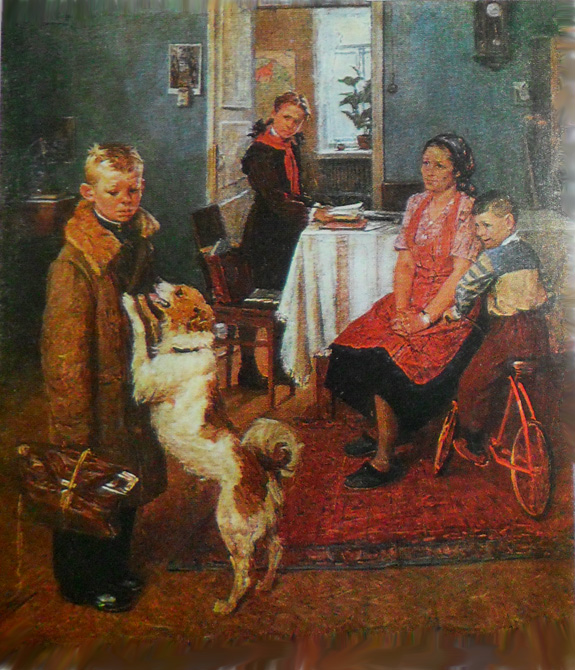 Скажи пожалуйста, Вовка, ты тоже размеры всех фото уменьшаешь? Меня это напрягает. Какую не вставляю с компа - большой размер. Пока уменьшаешь, минут пять пройдёт. Может как-то по другому можно? На других форумах у меня сразу вставляются без всяких уменьшений. А где у нас вообще командир-то? Чёт его давно не видно. По теме. Очень хорошо помню, как мы писали сочинение по картине Решетникова "Опять двойка". |