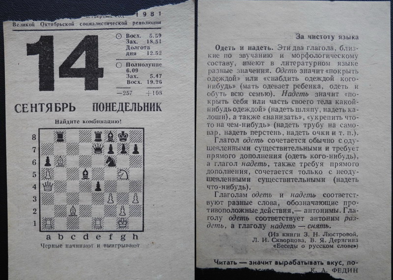 Что интересно, такой календарь всегда был в доме у деда, а вот уже в нашей семье эта традиция почему-то не прижилась. Дед всегда острым ножом подравнивал следы оторванных листков, поэтому календарь даже в конце календарного года находился в идеальном состоянии. Мы, дети, тоже любили изучать и начало восхода солнца и заката, ну и конечно события или стихотворения или анекдоты, в общем, информацию на этих листочках. А вот засолка огурцов казалась нудятиной, хотя сами огурцы поедались активно:)