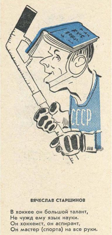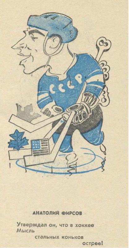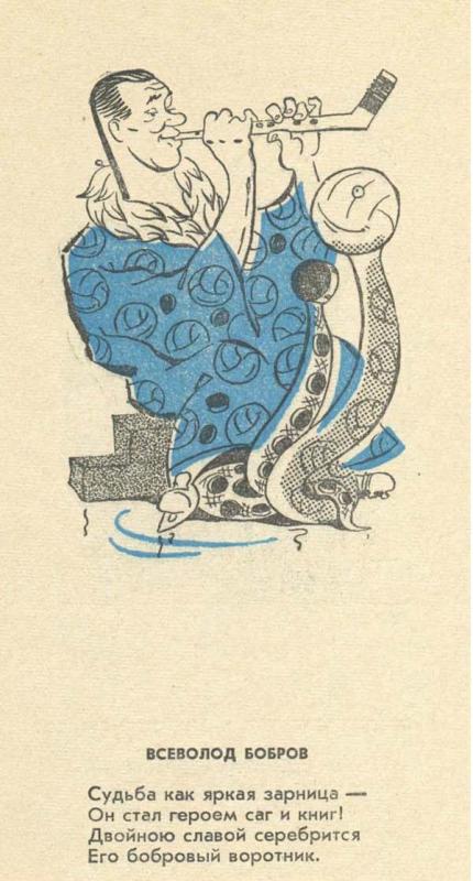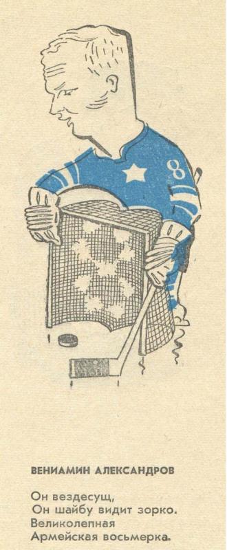 Узнал без подписи Боброва, Чернышова и Тарасова, Старшинова. Остальных нет (и Мальцева, как не странно). В Советском Спорте шаржи на игроков появлялись во время "Приза Известий", даже помню некоторые фамилии: Лаксола (Финляндия), Сикора и Буковински (ЧССР). Газет не сохранилось, показать не смогу. Буковински из сборной Чехословакии вообще был уникален - играл в сильнейших очках.