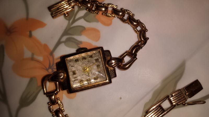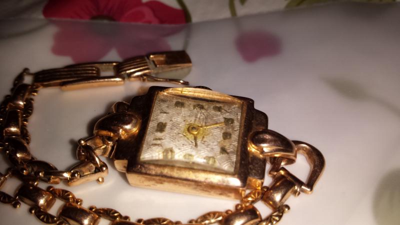 К вопросу о женских часах. Подарок бабушке на свадьбу, 1947 г. До сих пор ходят, точность не ах, но для такого возвраста (не разу не чистились и не ремонтировались)! И корпус и браслет, золото 535 пробы, весом 19 гр. Вот и поверь, что плохо жили. Механизм не родной, но производитель не известен.