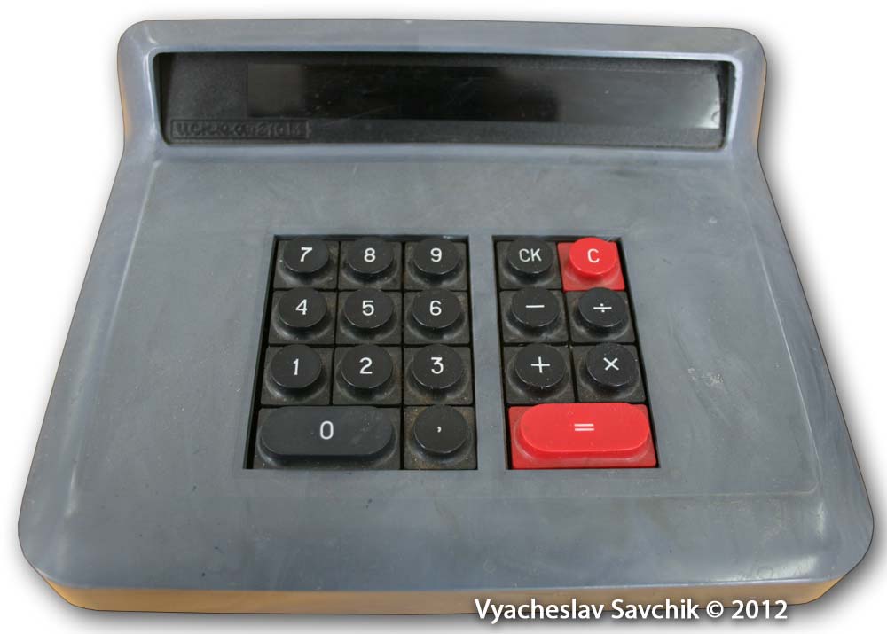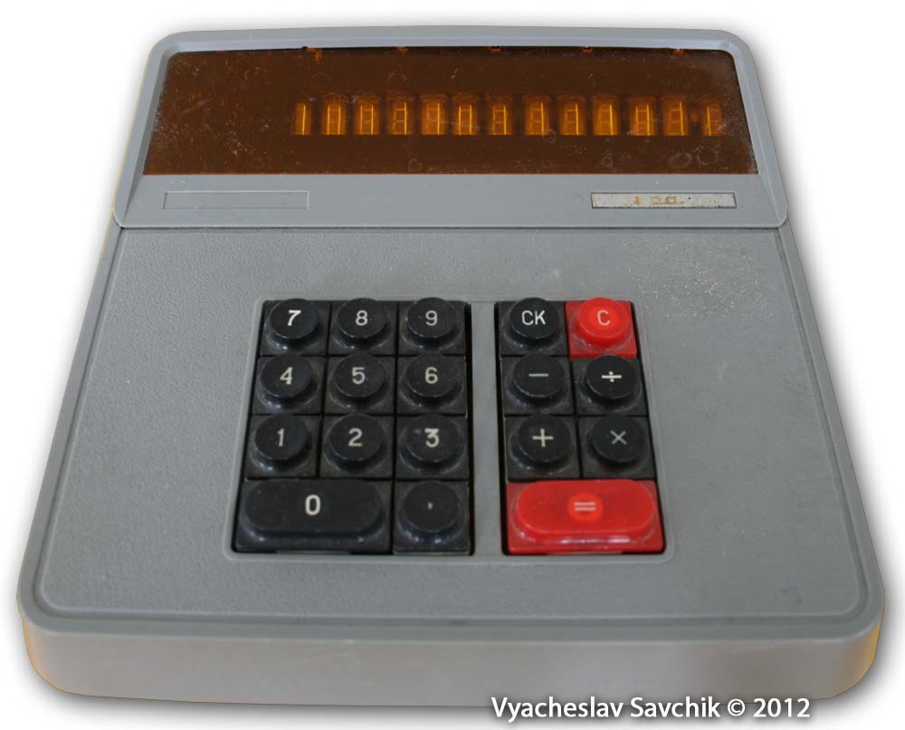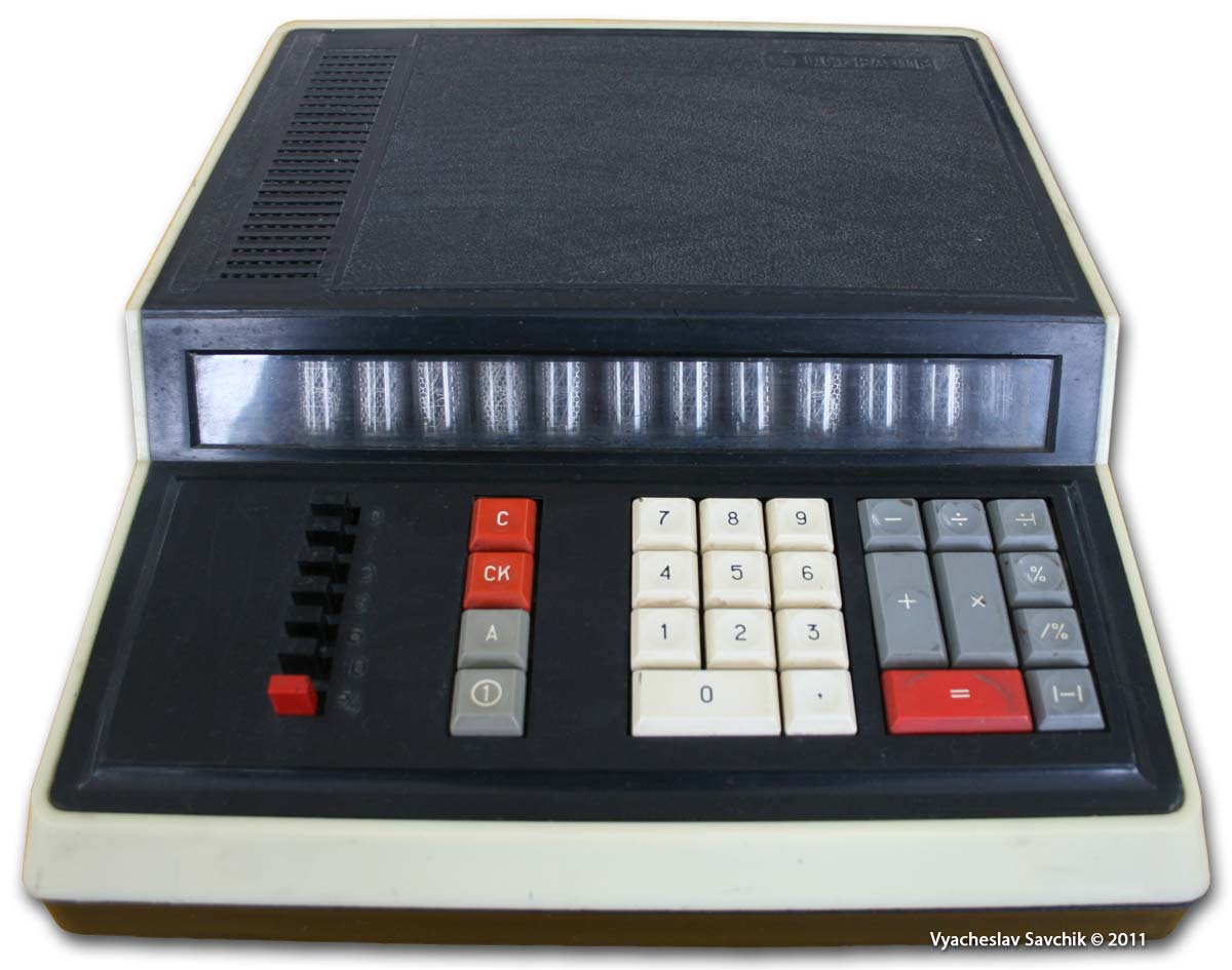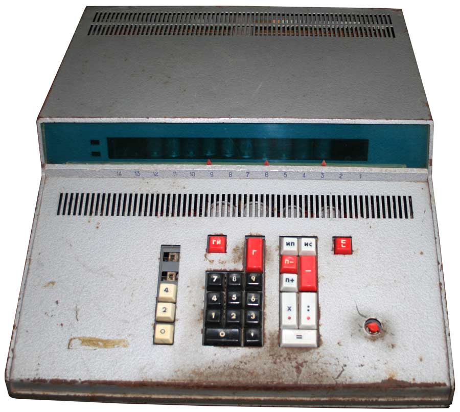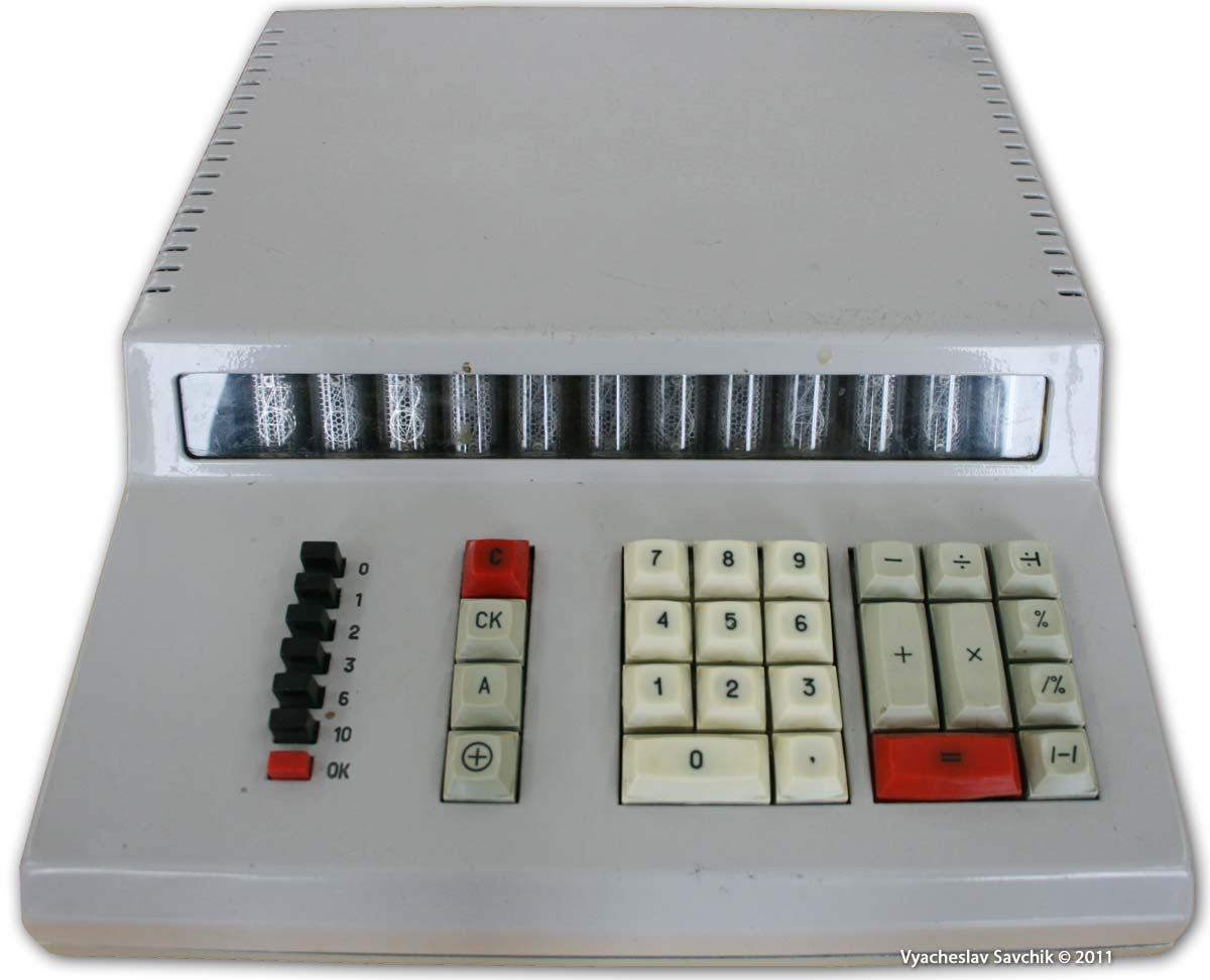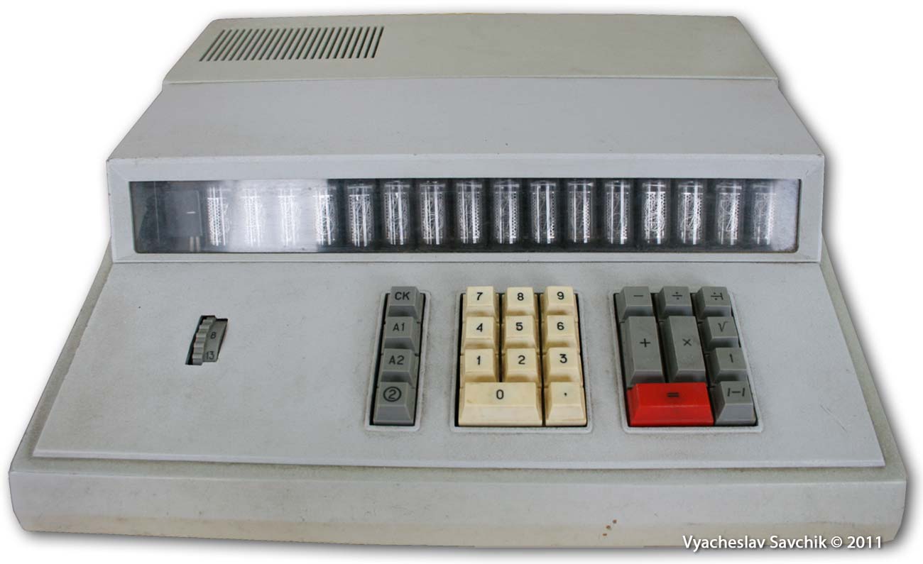 Калькулятор разработан в 1968 году. Собран полностью на диодах и транзисторах. Элементная база состоит из около 400 транзисторов, 700 диодов и 1400 резисторов и конденсаторов. 1 регистр памяти. Нет индикации отрицательного числа. При отрицательном результате число представляется в дополнительном коде. Калькулятор также выпускался под маркой "Электроника 68" в пластмассовом корпусе. - Л.Л.Муренко, Ю.Ф.Широков. Разработка и производство первых массовых вычислительных машин в электронной промышленности // Электронная промышленность. 2001. Юбилейный выпуск. Добавлено спустя 2 дня 1 час 55 минут 22 секунды: Вычислительная техника 1950-х Хроника - Обучение вычислениям на электромеханических счётных клавишных машинах. Работа на табуляторе. Решение дифференциальных уравнений. Осциллограф в качестве монитора. Электроинтегратор. Музей отечественной вычислительной техники -