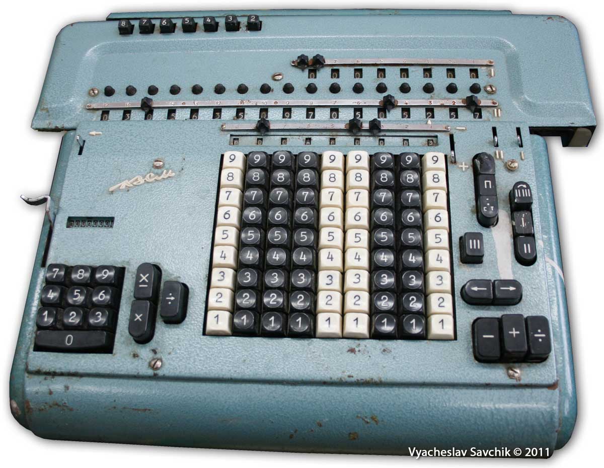 Электромеханический полноклавишный арифмометр на основе ступенчатого валика Лейбница. Самый дорогой, самый многофункциональный и самый тяжелый (22 кг) из отечественных электромеханических калькуляторов.