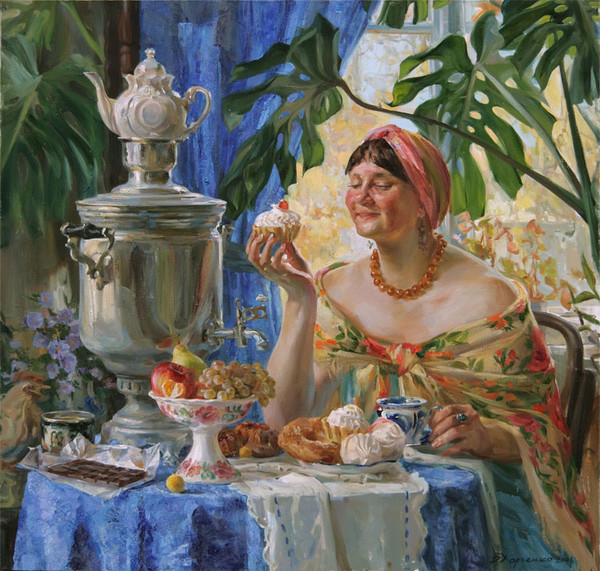 Обычай, древний на Руси. Единство, молодых и старых. Не веришь? Хоть кого спроси. Варенье, сладости, печенье, И сотами, янтарный мёд. Чай не еда, а угощение! Тут аромат от трав идёт. Говаривал один "светило". Почтенный, сельский эскулап. - Не выпил чай, какая сила! - А выпил, так совсем ослаб! От тульских братьев Баташовых*, Оглядываю самовар. Ручной работы и не новый. Кипит и чувствуется жар! Начищен, с блеском отражения, В нём вижу все черты лица. Бурлит внутри "фонтан сражения", За тонкой стенкой, без конца. На нём четырнадцать медалей. И все медали разных лет. Вы, где-нибудь, сие видали?! Не самовар, - сам раритет! Вот, оно русское наследие, Великих, тульских мастеров! Изделие, из чистой меди, Чтобы хозяин был здоров! Заварим чай из самовара, С кипящей, ключевой водой! В нём угли, отыскрятся жаром, И лягут пеплом на покой. Вот так-то вот, мой друг любезный! Я речь свою, веду о том. Из самовара чай, полезный, Когда потянет в нос дымком! А.Лихачёв |