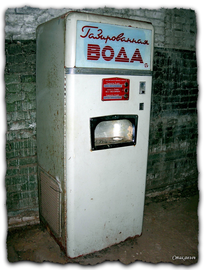 Газировку можно было купить и не только из автоматов, а еще у тетеньки за стойкой, на которой располагались кран, два сообщающихся U-образных сосуда с сиропом, рядом - кажется, газовый баллон. Газировку (ее обычно заказывали с двойным сиропом - так было слаще) продавщица приготовляла тут же. (сцена с такой газировкой запечатлена в знаменитом фильме "Подкидыш" - там ее пьет героиня, которую играла Фаина Раневская, с девочкой и Мулей)